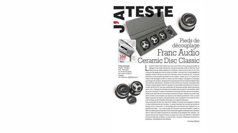 “Why not treat yourself, given the real benefit of the Ceramic Disc Classic under vibration-sensitive equipment, at an affordable price? Especially since they’re aesthetically pleasing and add a touch of class. You’ll just need to make some room in your cabinet, as they’re 45 mm high (a Slim version is also available). It’s always surprising to see the benefits of well-designed and well-made decouplers, crafted by skilled engineers. This is certainly the case with these decidedly successful Franc Audio decouplers.”