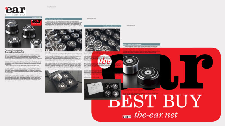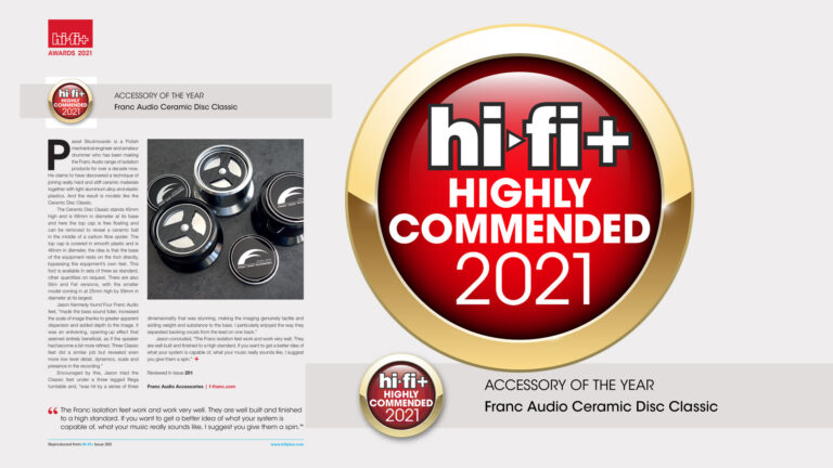 “Franc Audio Accessories Ceramic Disk Slim Foot… Surprisingly effective! A well-made set of ceramic iso-feet from Paweł Franc Skulimowski of Poland, that actually improves speed, dyamics, weight and image specificity to both the New Audio Frontiers’ 300B SE integrated and Grandinote Demone mono amps…” (Clement Perry)